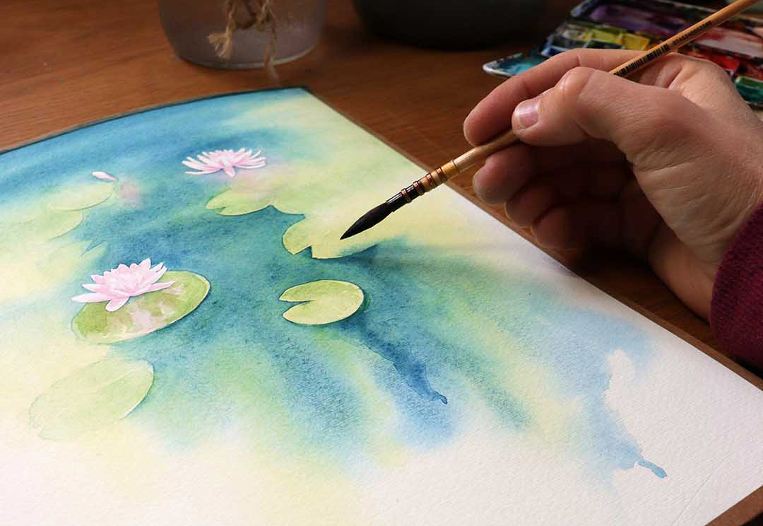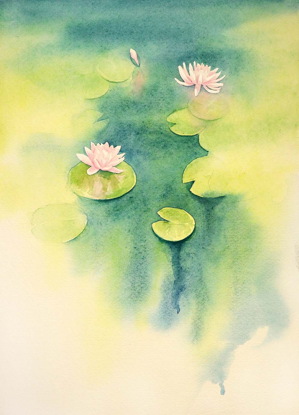 a zkoušet a jako hlavní motiv si namalujeme vodní hladinu s lekníny.